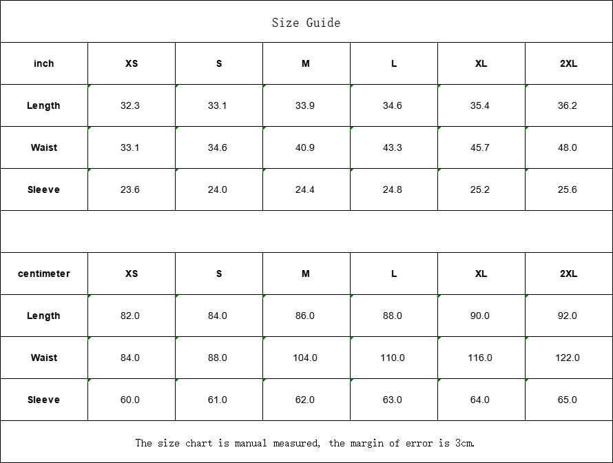 | Sleeve | 23.6 | 24.0 | 24.4 | 24.8 | 25.2 | 25.6 |