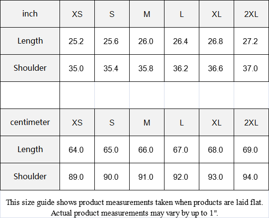This size guide shows product measurements taken when products are laid flat. Actual product measurements may vary by up to 1".