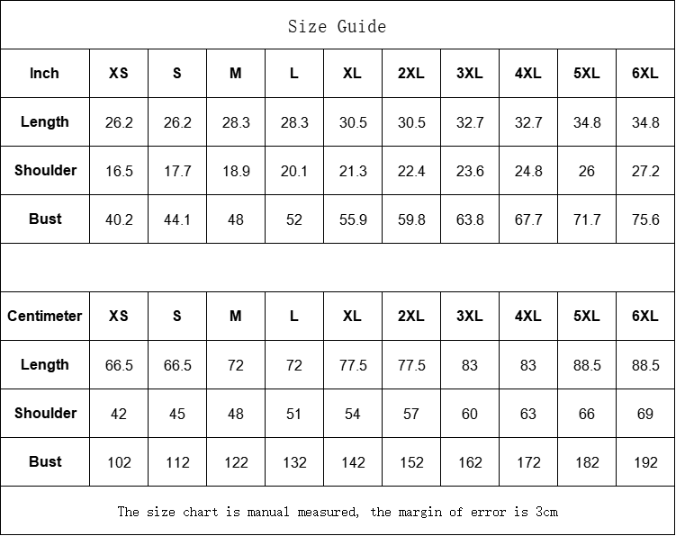| Centimeter | XS | S | M | L | XL | 2XL | 3XL | 4XL | 5XL | 6XL |