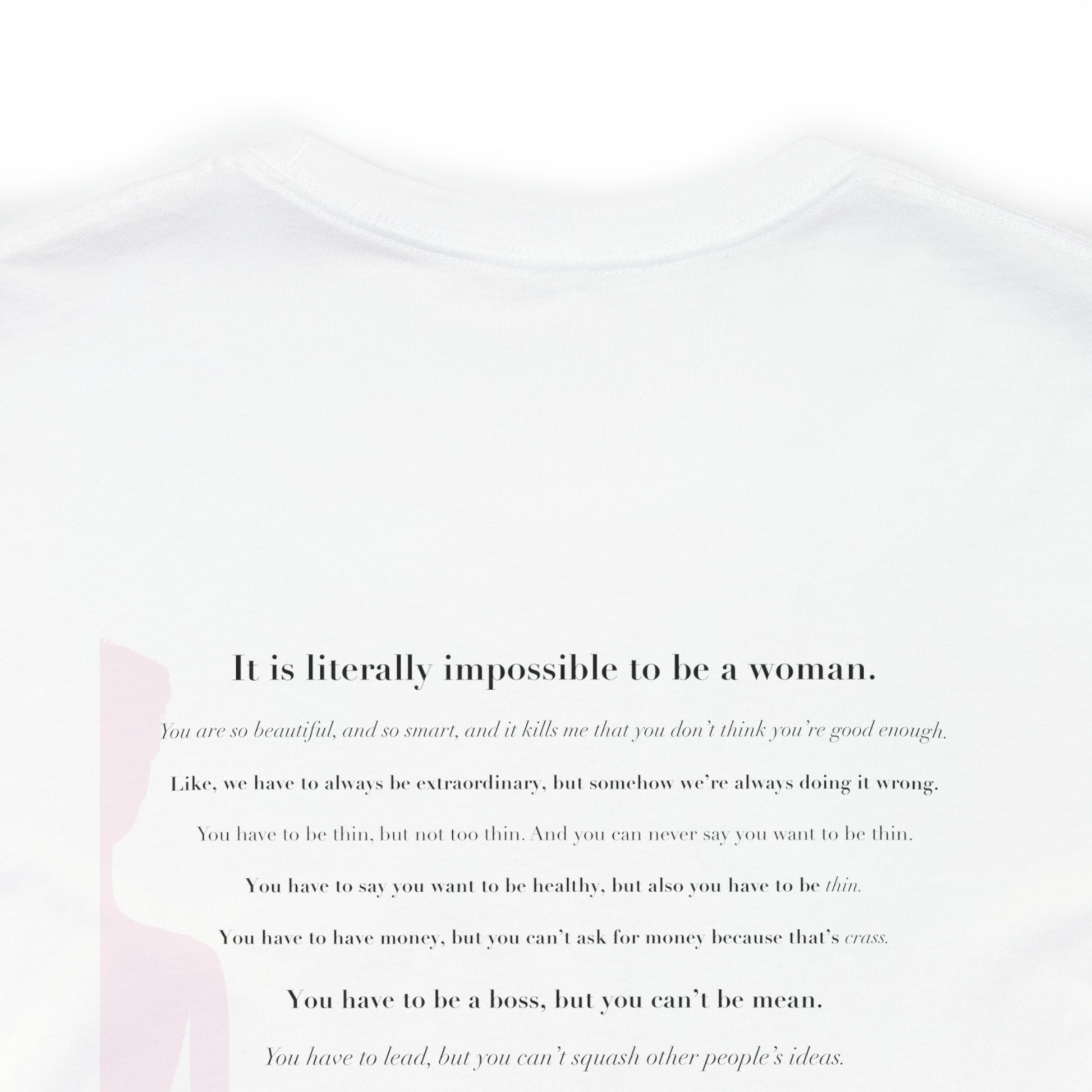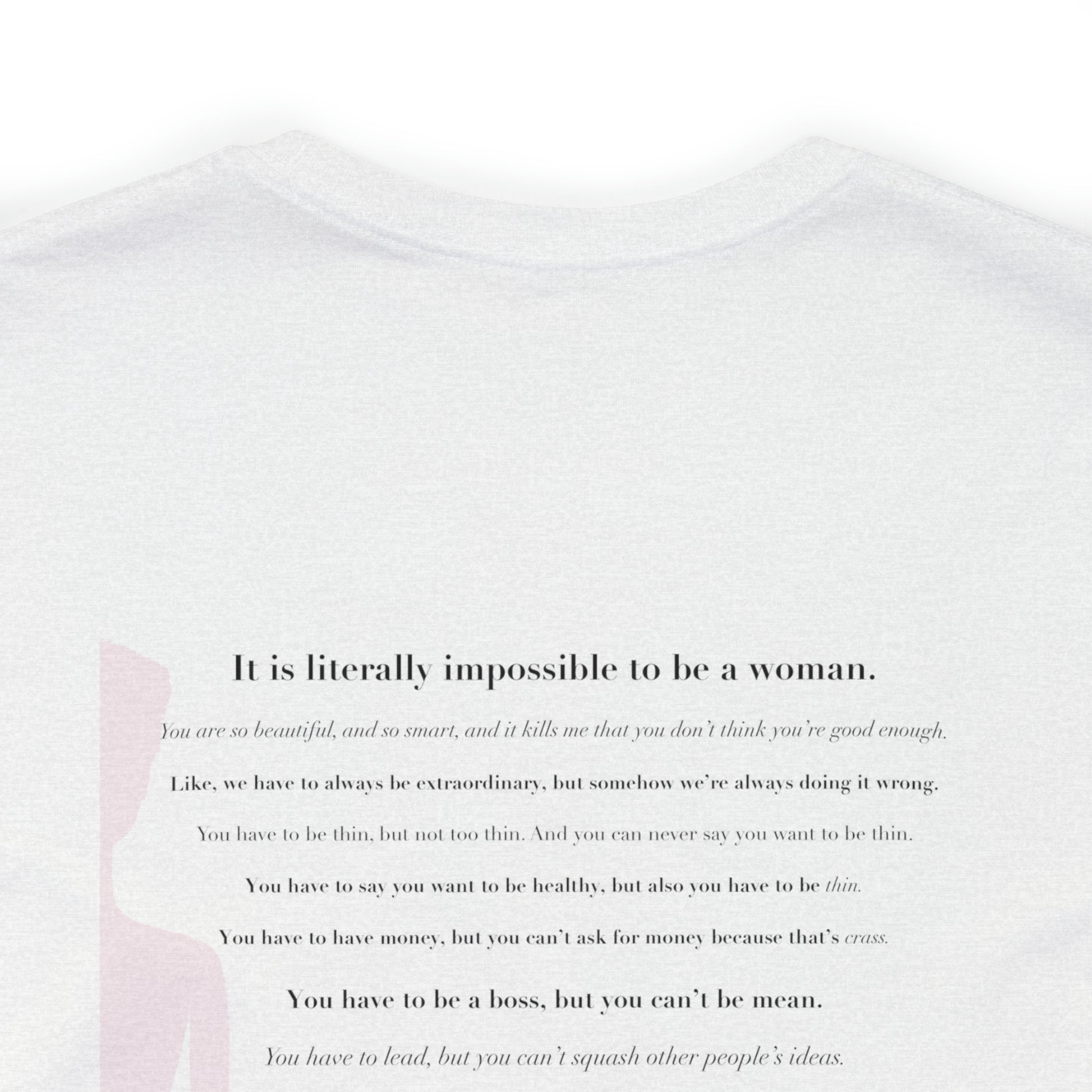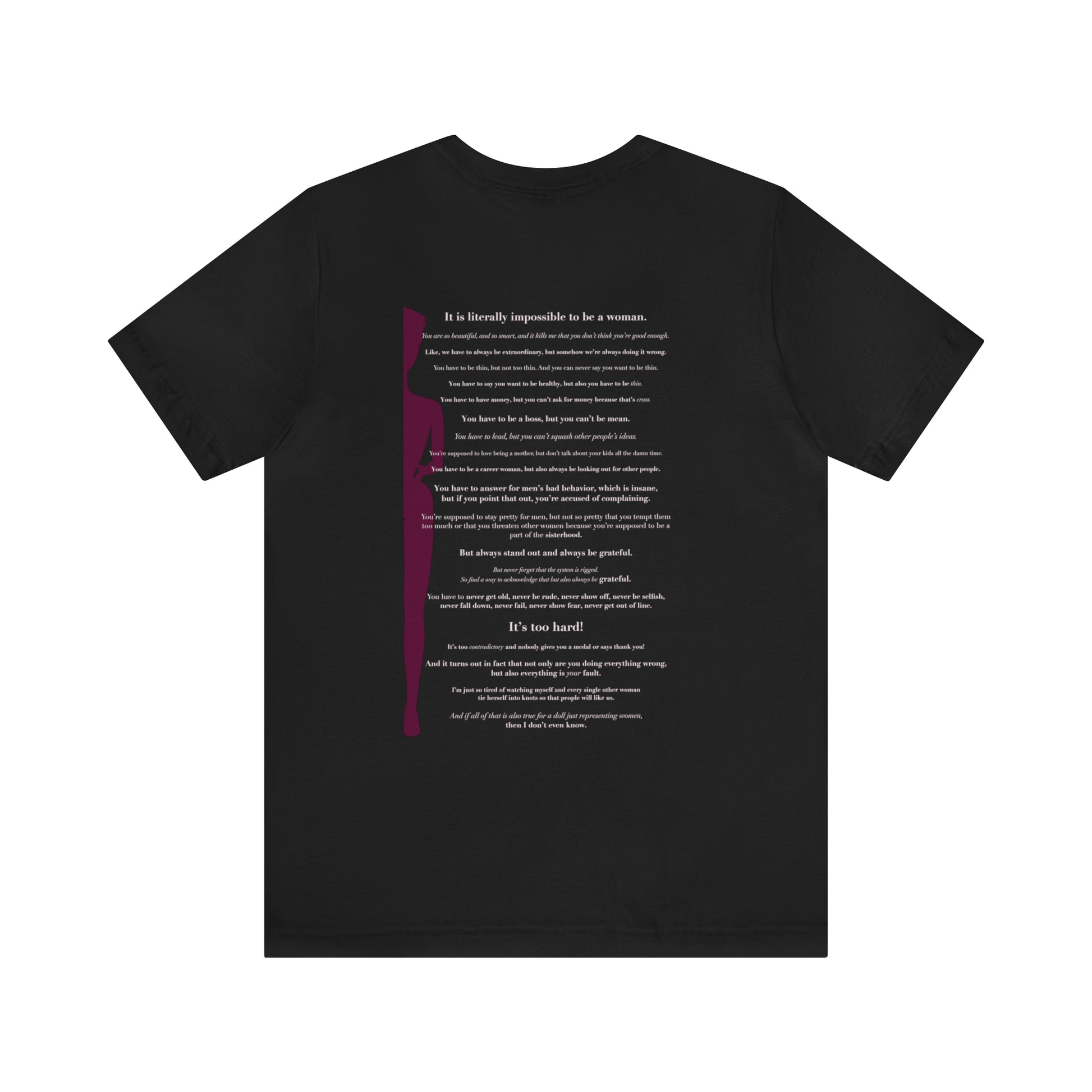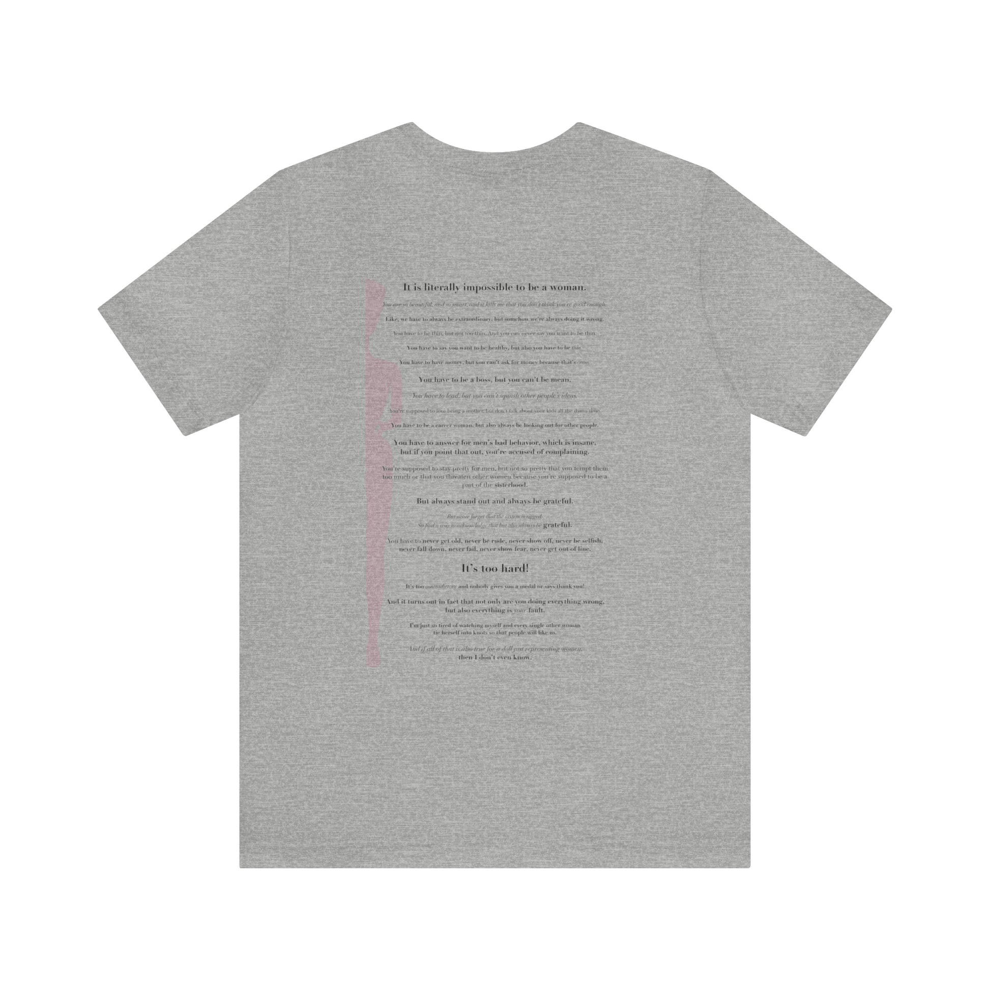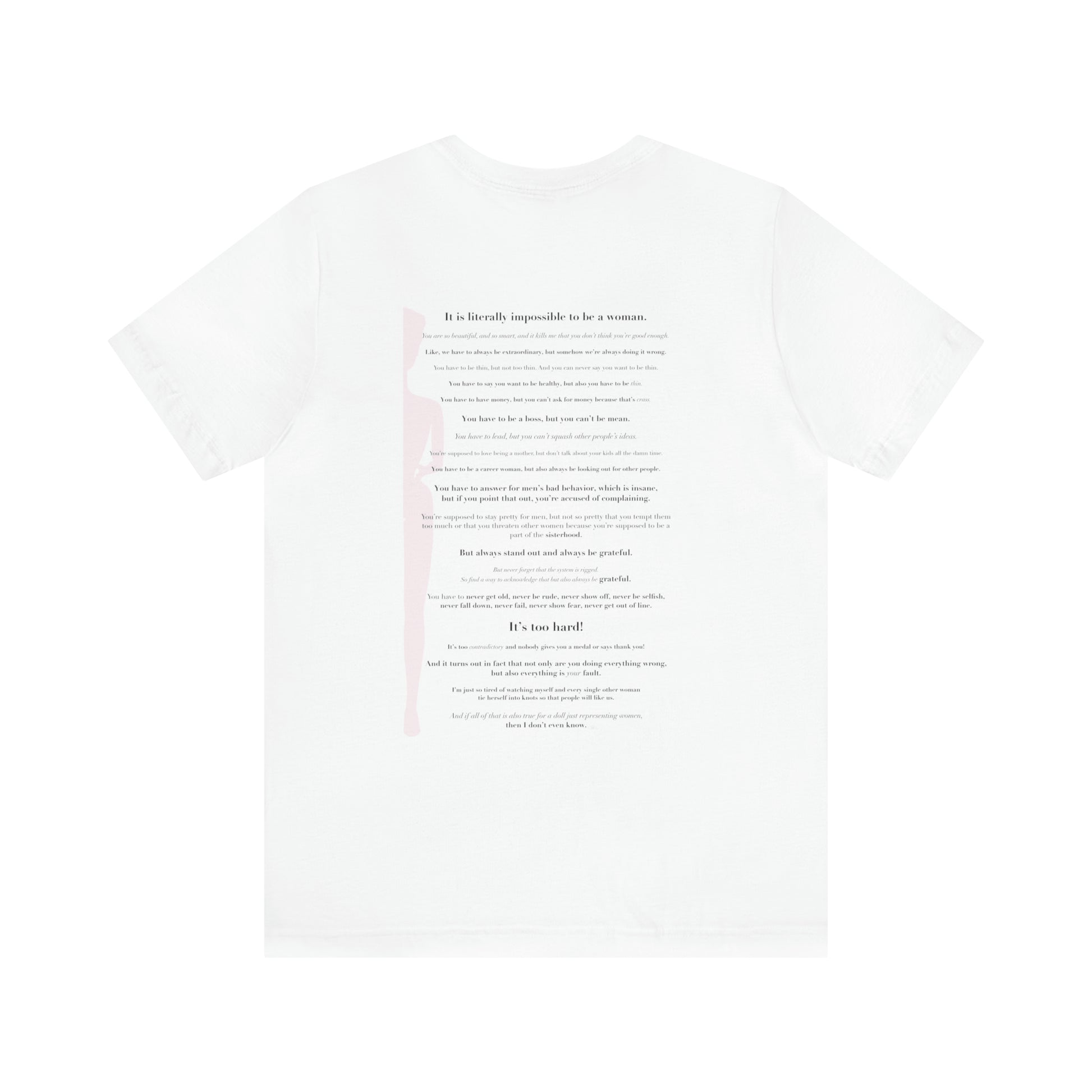 This classic unisex jersey short sleeve tee fits like a well-loved favorite. Soft cotton and quality print make users fall in love with it over and over again. These t-shirts have-ribbed knit collars to bolster shaping. The shoulders have taping for better fit over time. Dual side seams hold the garment's shape for longer.